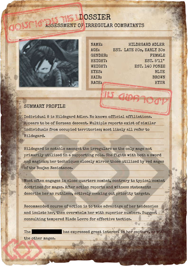 Hildegard spent an extensive amount of time fighting alongside the Bozjan Resistance, typically participating in both clandestine, irregular operations as well as taking the field in larger scale engagements. She fought alongside many a stalwart ally--as well as against many a formidable foe. Per recovered IVth Legion documents, her exploits in Bozja did not go unnoticed.